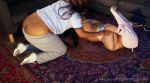 _ _ _ _ BUSTY FOREIGN EXCHANGE STUDENT BUSTED IN STRIP-DANCE SCANDAL. Super sexy busty Beyonce look-alike Dani Charbroyd first enters the dorm straight out of class wearing a tight sweater under her black overalls. She starts to dance to the loud music playing, and once she puts her backpack down, she starts to dance in a very wild and sexually suggestive manner. She jumps around and complains that, since she's not wearing the right bra, - her boobs keep popping out under her sweater, and she has to stop dancing a few times to adjust her bra, and pull it back up over her tits. As she continues to dance, her short, tight sweater starts to rise up and over her big boobs, and the camera man zooms in as she pauses again to pull her bra back up over her nipple that has popped out. As she dances around in her crazy style- the straps of her loose overalls fall down to her elbows, and her white panties are exposed. Then she lets her overalls fall down to her knees and taunts the camera - showing off her hairy pussy as well as her ass. Dani suddenly screams, as she spots the approaching dorm R.A. Miss Vee --who is in charge of her floor, and tries to quickly cover up, --but it is too late. She has been seen violating the rules of the dorm, and the R.A. -who is a much larger girl - starts to yell at Dani and physically 'manhandles' her - shoving her down on the couch, ripping her overalls -tearing them down the side all the way to her ankles, and then violently drags her off of the couch as she plops on the floor still half naked. After Miss V traps Dani by pulling her sweater up over the top of her head, Dani returns the gesture, stripping the R.A. of her t-shirt, as other students in the background laugh, due to her big butt crack hanging out over the top of her sagging sweat pants. She eventually leaves Dani alone, with her tits hanging out of her bra, and her overalls totally ripped off, but still tangled around the bottom of her feet.